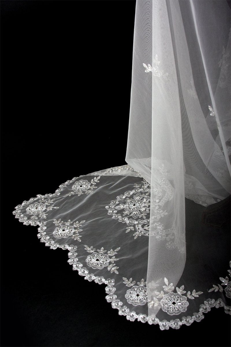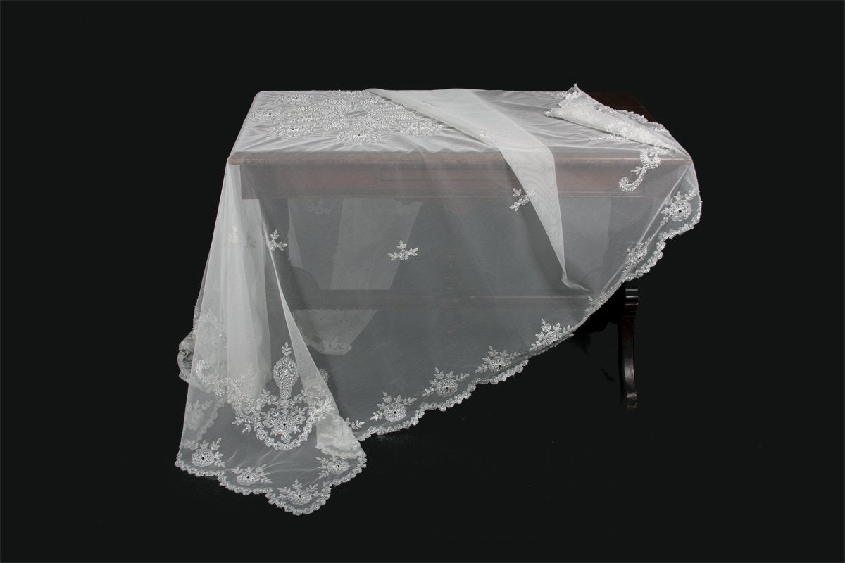 - Gorgeous lace table cloth Floral designs and beaded accents.